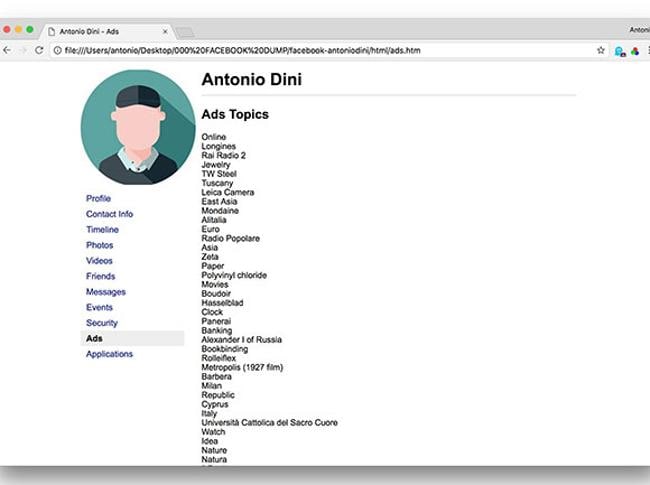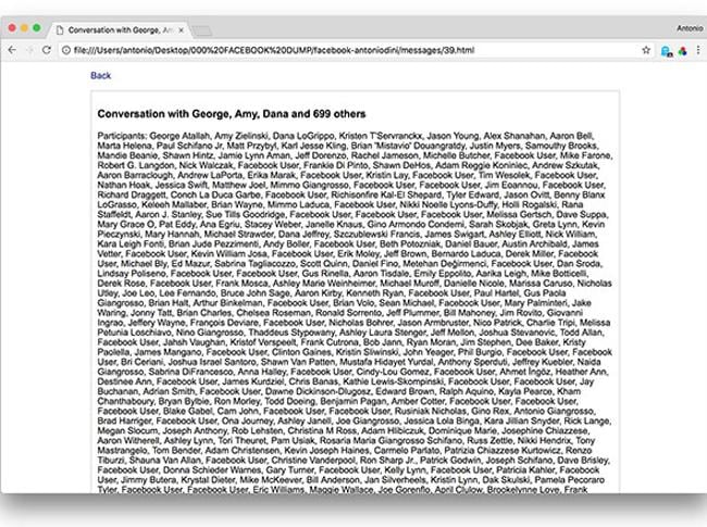 Dentro ho trovato una serie di cartelle e di pagine Html, cioè pagine web locali. La prima, Index.html, contiene il registro generale delle mie attività. Si parte da qui. Prima di aprirla, però, mi sono procurato e ho modificato alcuni script che permettono di analizzare trasversalmente i dati alla ricerca di informazioni che possono essere state messe in pagine non linkate alla principale e quindi difficili da trovare. Un controllo di sicurezza con esito per me positivo: niente registro delle mie telefonate, né copia degli sms o degli mms inviati e ricevuti, né posizioni Gps abituali. Anche i 2.551 contatti della mia rubrica telefonica (la vera dote di ogni buon giornalista) non sono stati “presi” da Facebook e questo è un bene, almeno per chi fa la professione del cronista ma non solo, perché dentro ci sono numeri riservati, i diretti di personaggi pubblici e rappresentanti delle istituzioni. Come potrei giustificare con la Gdpr se questi numeri venissero presi da Facebook e poi girati ad aziende terze?