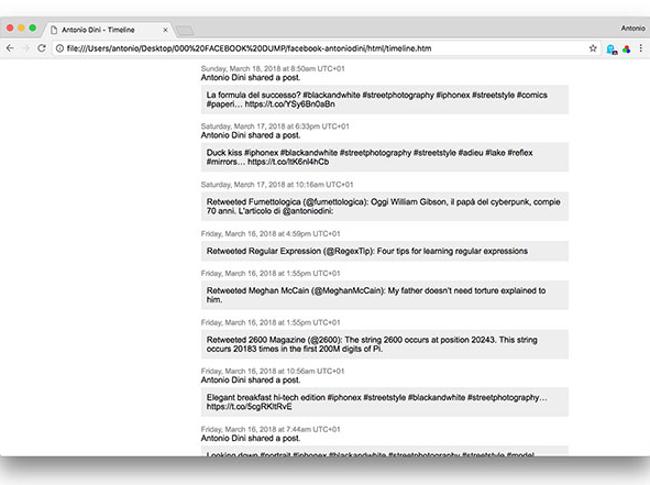 Nell’archivio dei miei dati, Facebook mi propone una serie di opzioni: navigare verso la timeline del mio muro, guardare le foto che ho postato e condiviso (pochissime, solo otto, perché per quello adopero Instagram), i video (una trentina, sono vecchio), la lista degli amici (sono 1.759, inclusi quelli che mi hanno chiesto l’amicizia e sono ancora sospesi e quelli a cui invece l’ho declinata, oltre a quelli che mi hanno cancellato), i messaggi inviati e ricevuti nella chat di Facebook (1.600 conversazioni in tutto, la prima con Alice, fidanzata di una vita fa, documentata fino all’ultima parola di una storia che se volessi ricordare a memoria oggi farei fatica a focalizzare), gli eventi a cui ho partecipato e quelli a cui non sono andato (ma ho mostrato interesse): il primo è “Web Match - Lui, lei, la rete” allo Smau dell’ottobre 2008, segue la presentazione del libro “Non stimo Nedved” e poi “Sostieni Save The Children su TripAdvisor“. Solo scorrere questi 12.000 eventi circa è un viaggio nel tempo.
