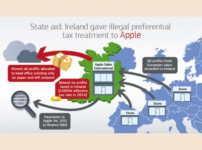 A far scuola è stato il caso Apple (figura 1). Nel 2016 la Commissione sanzionò l'azienda per 13 miliardi di imposte non pagate tra il 2003 e il 2014. Apple aveva infatti stabilito due sussidiarie in Irlanda, Apple Sales International e Apple Operation Europe, che avevano siglato un cost sharing agreement con la casa madre Apple Inc. in base al quale avrebbero pagato ogni anno il 60 per cento dei costi di ricerca e sviluppo. Apple ha sfruttato il fatto che queste sussidiarie non erano tassabili per il fisco statunitense, in quanto registrate in Irlanda, ma nemmeno per il fisco irlandese, poiché il management era gestito dalla California e la regolamentazione irlandese ritiene una società imputabile fiscalmente laddove risiede il proprio management. Il cost sharing agreement estendeva alle sussidiarie irlandesi il diritto di proprietà intellettuale sui prodotti Apple. In base all'accordo ottenuto con l'Irlanda tutti i profitti dalle vendite negli store dei vari paesi UE venivano registrati automaticamente a Dublino. I profitti confluiti nelle sussidiarie erano successivamente sottoposti all'imposta sulle imprese solo in minima parte, mentre per la maggior parte venivano internamente attribuiti a una sede centrale esistente solo sulla carta e perciò senza residenza fiscale. Di conseguenza, la tassazione effettiva sugli utili si ridusse dall'1 per cento del 2003 allo 0,005 per cento del 2014. Nel frattempo, parte degli utili veniva trasferita in California per finanziare la ricerca.