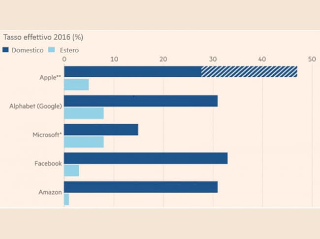 La situazione non è molto diversa Oltreoceano come testimoniano i dati del Financial Times. Nel 2016 le imposte effettive che i giganti hi-tech americani hanno pagato sui profitti all'estero sono state sensibilmente inferiori rispetto a quelle sui profitti domestici (figura 2). Donald Trump ha risposto con un massiccio taglio alle imposte nella speranza di riportare in patria i profitti parcheggiati all'estero: da un lato riducendo l'aliquota sul reddito d'impresa dal 35 al 21 per cento, dall'altro offrendo un'aliquota agevolata al 15,5 per cento al rimpatrio una tantum dei profitti detenuti offshore. Infatti la regolamentazione statunitense, prevedeva che i profitti ottenuti all'estero non venissero tassati finché non rimpatriati sotto forma di dividendi alla casa madre (worldwide method), facendo sì che le imprese accumulassero centinaia di miliardi di profitti offshore, come avvenuto per Apple in Irlanda. Dalla riforma Trump si adotta invece il sistema territoriale, ovvero si pagano le tasse nel paese dove si producono gli utili.